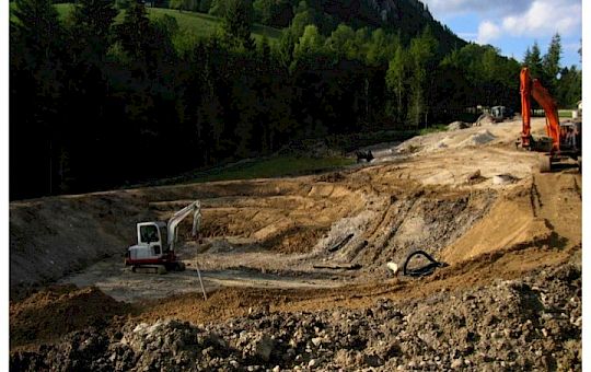 In 2008 a marsh meadow was drained, in order to extend the green around the cottage. The flushing waters have been drained into culverts dug around the reclaimed area. The culverts heed to a broad ditch dug at the south end of the reclaimed area, where they feed a pond, whose shore is made of grass and natural river stones.